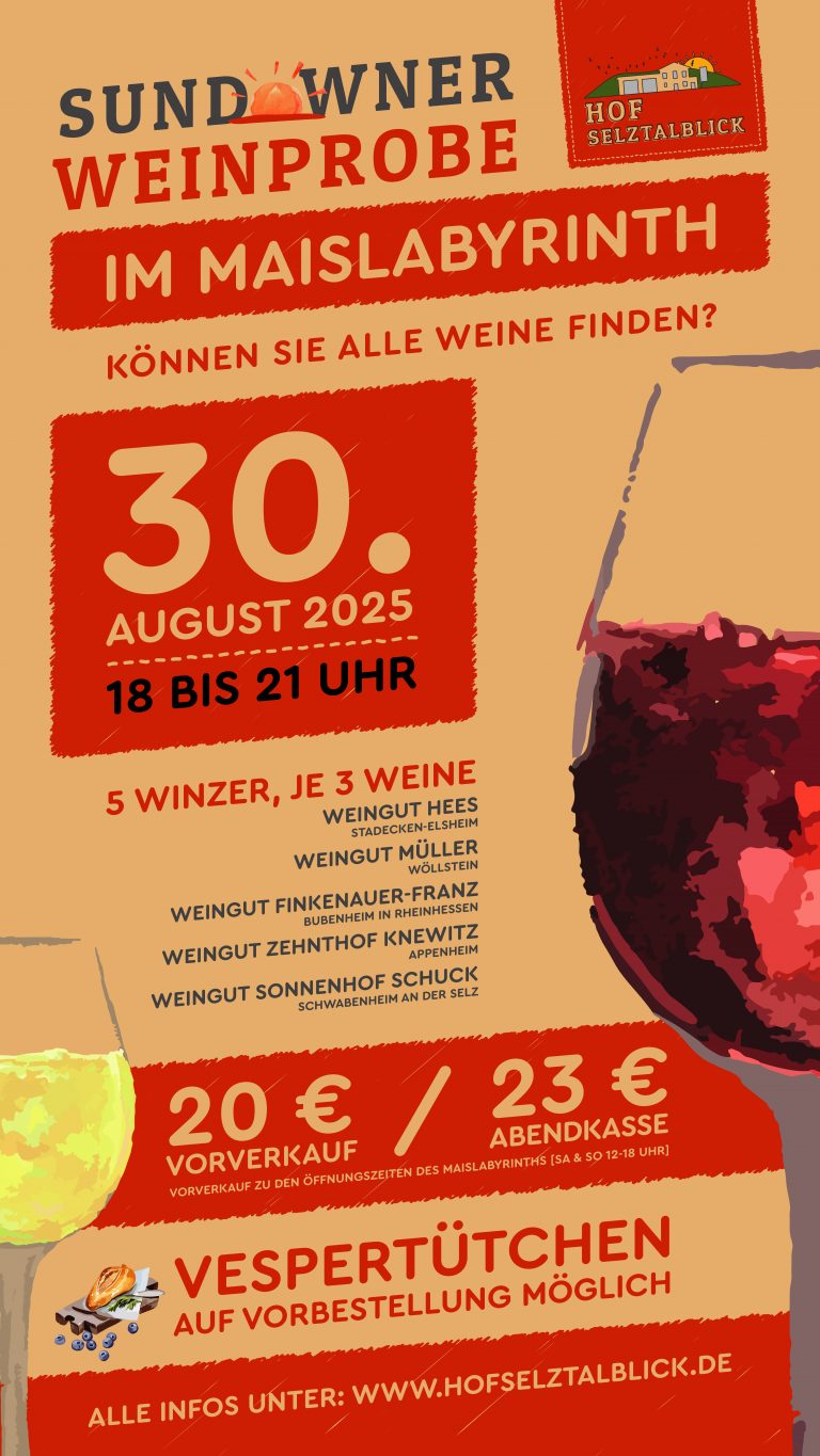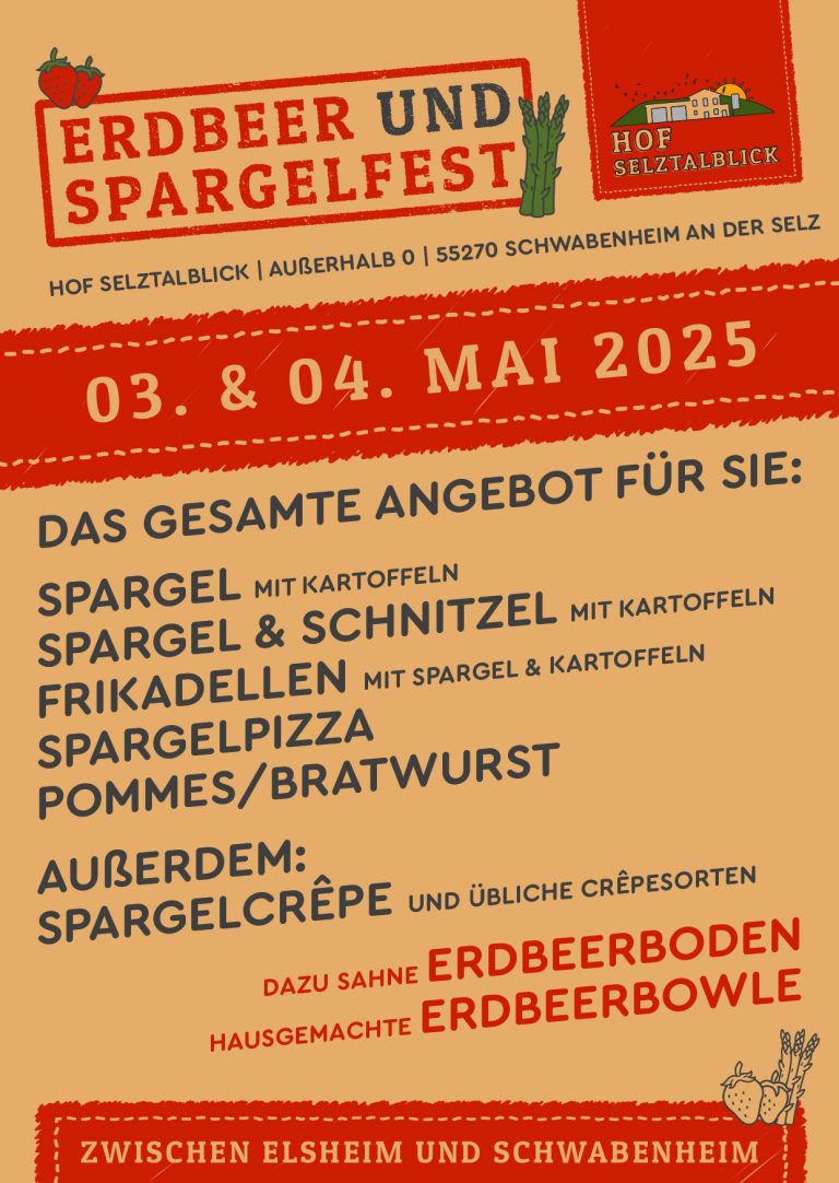 Startseite Öffnungszeiten Termine Kontakt Impressum Menü Startseite Öffnungszeiten Termine Kontakt Impressum Herzlich Willkommen! Informieren Sie sich auf unserer Homepage über anstehende Veranstaltungen wie auch aktuelle Informationen & Angebote.Wir freuen uns auf Ihren BesuchIhr Team vom Hof Selztalblick Unser Hofladen öffnet für Sie in der Spargel- & Erdbeerzeit:Von 19. April (Ostersamstag) bis voraussichtlich 30. Juni 2025ist unser Hofladen für Sie geöffnet.Öffnungszeiten siehe hier NÄCHSTE EVENTS:Siehe auch unter Termine.